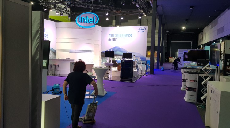 Die Vorreinigungsarbeiten laufen im vollen Gange für die Messe Cloudfest 2019 im Confertainment Center des Europaparks Rust.